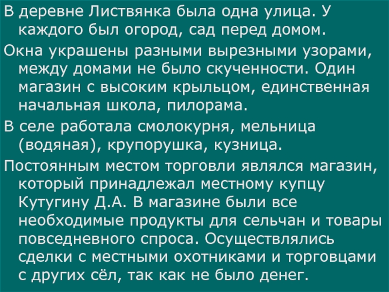 Слайд 10В деревне Листвянка была одна улица. У каждого был огород, сад