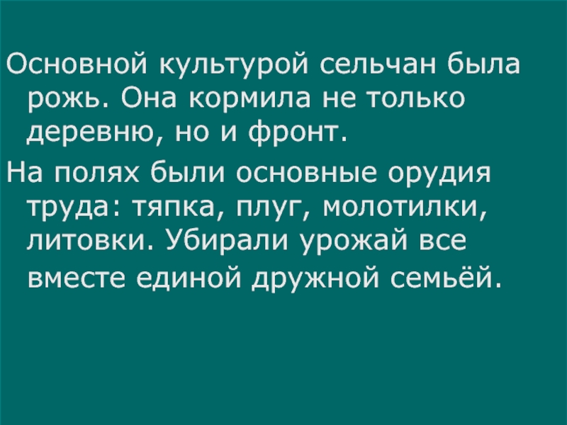 На полях были основные орудия труда: тяпка, плуг, молотилки, литовки. Убирали урожай все вместе единой дружной семьёй.