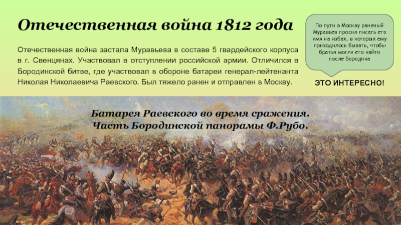 По пути в Москву раненый Муравьев просил писать его имя на избах, в которых ему приходилось бывать, чтобы братья могли его найти после Бородина