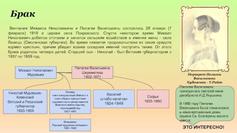 Пелагея Васильевна приходилась сестрой жене декабриста И.Д.Якушкина.
