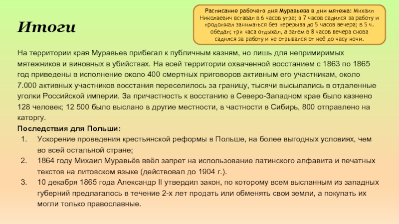 Расписание рабочего дня Муравьева в дни мятежа: Михаил Николаевич вставал в 6 часов утра; в 7 часов садился за работу и продолжал заниматься без перерыва до 5 часов вечера; в 5 ч. обедал; три часа отдыхал, а затем в 8 часов вечера снова садился за работу и не отрывался от неё до часу ночи.