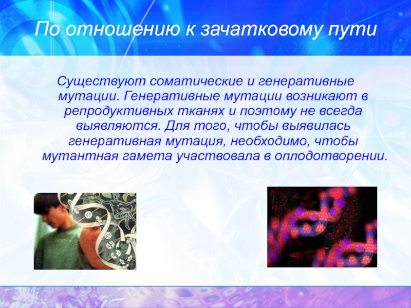 возникают в репродуктивных тканях и поэтому не всегда выявляются. Для того, чтобы выявилась генеративная мутация, необходимо, чтобы мутантная гамета участвовала в оплодотворении.