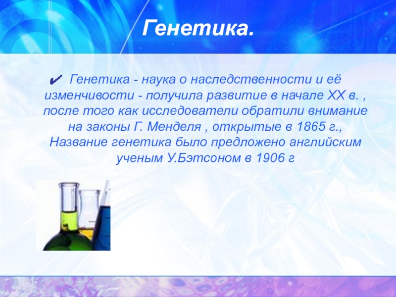 развитие в начале XX в. , после того как исследователи обратили внимание на законы Г. Менделя , открытые в 1865 г., Название генетика было предложено английским ученым У.Бэтсоном в 1906 г