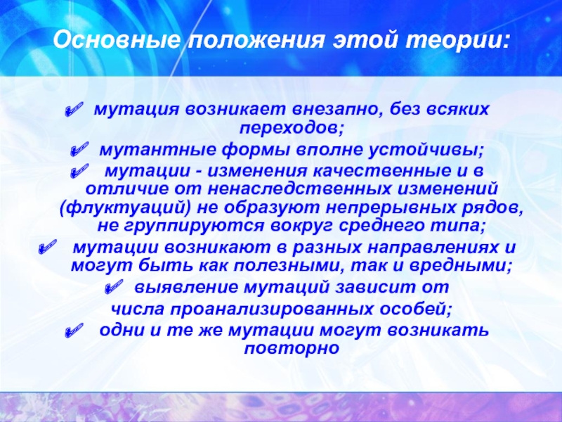 Организмы у которых произошла мутация называются мутантами. Мутационная теория