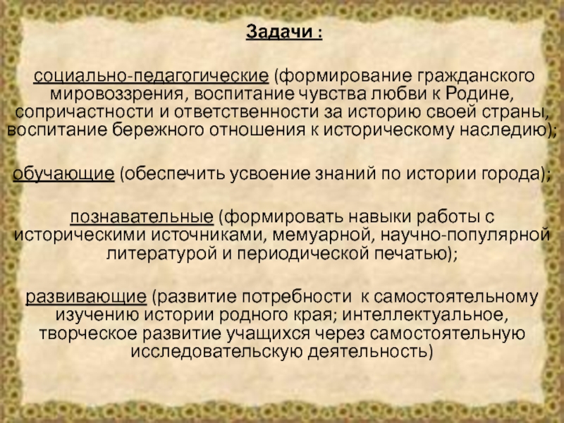 развивающие (развитие потребности к самостоятельному изучению истории родного края; интеллектуальное, творческое развитие учащихся через самостоятельную исследовательскую деятельность)
