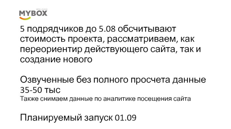 5 подрядчиков до 5.08 обсчитывают стоимость проекта, рассматриваем, как переориентир действующего
