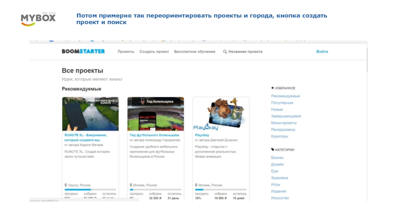 Слайд 5Потом примерно так переориентировать проекты и города, кнопка создать проект и