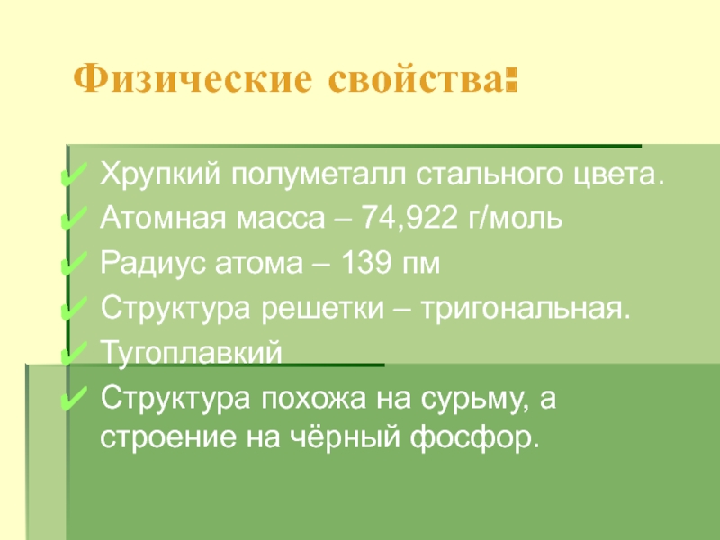 Мышьяк чистоты 99,9999 % используется для синтеза арсенидов и сложных алмазоподобных полупроводников.