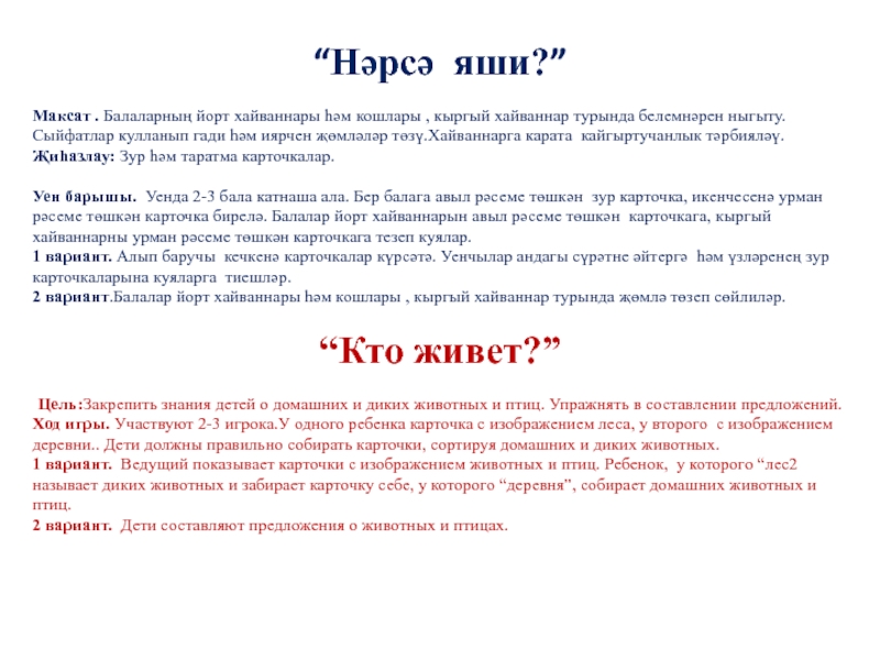 2 вариант.Балалар йорт хайваннары һәм кошлары , кыргый хайваннар турында җөмлә төзеп сөйлиләр.