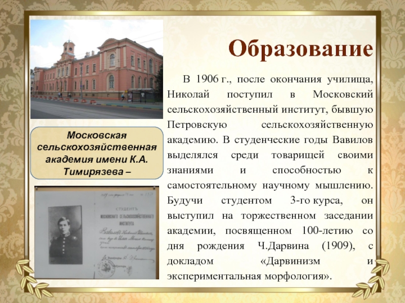 институт, бывшую Петровскую сельскохозяйственную академию. В студенческие годы Вавилов выделялся среди товарищей своими знаниями и способностью к самостоятельному научному мышлению. Будучи студентом 3-го курса, он выступил на торжественном заседании академии, посвященном 100-летию со дня рождения Ч.Дарвина (1909), с докладом «Дарвинизм и экспериментальная морфология».