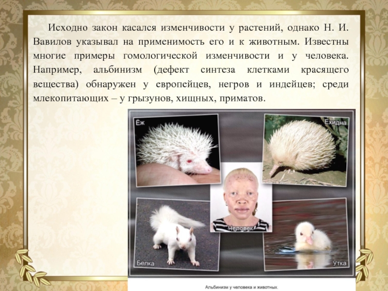 на применимость его и к животным. Известны многие примеры гомологической изменчивости и у человека. Например, альбинизм (дефект синтеза клетками красящего вещества) обнаружен у европейцев, негров и индейцев; среди млекопитающих – у грызунов, хищных, приматов.