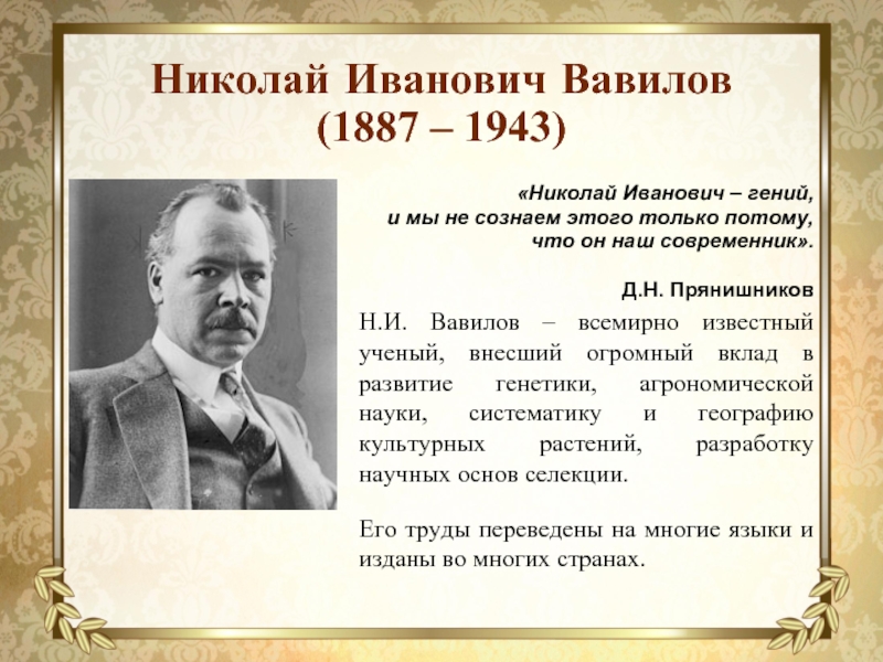 Н.И. Вавилов – всемирно известный ученый, внесший огромный вклад в развитие генетики, агрономической науки, систематику и географию культурных растений, разработку научных основ селекции.