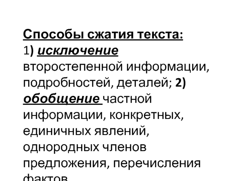 текста и детали (подробности), затем убрать детали, объединить существенное и составить новый текст ( исключение отдельных слов, словосочетаний, фрагментов предложений, исключение одного или нескольких синонимов в ряду однородных членов, исключение вводных, уточняющих и поясняющих конструкций, исключение одного или нескольких предложений)
