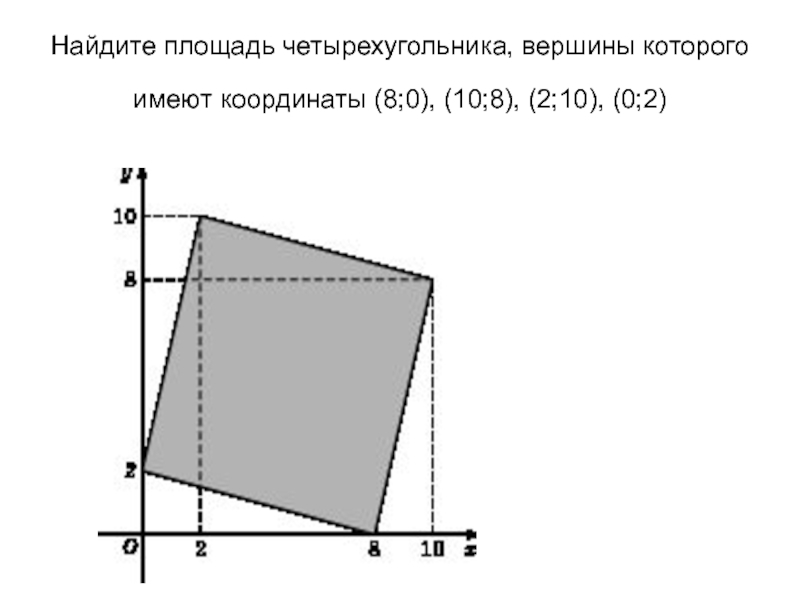 Слайд 15Найдите площадь четырехугольника, вершины которого имеют координаты (8;0), (10;8), (2;10), (0;2)