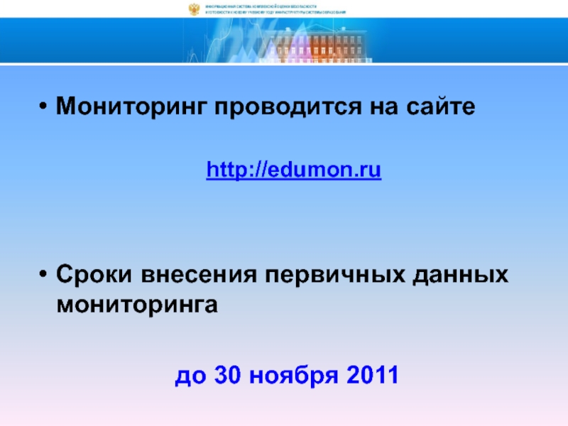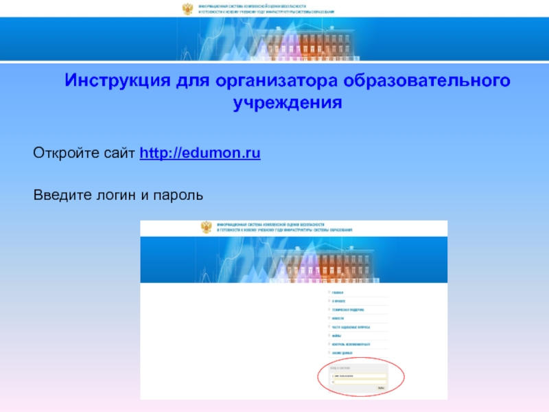 на сайт http://edumon.ru. Авторизоваться под учетной записью муниципального Организатора.