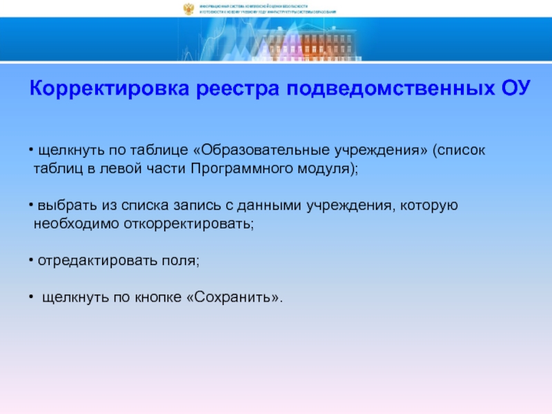выбрать из списка запись с данными учреждения, которую необходимо откорректировать;