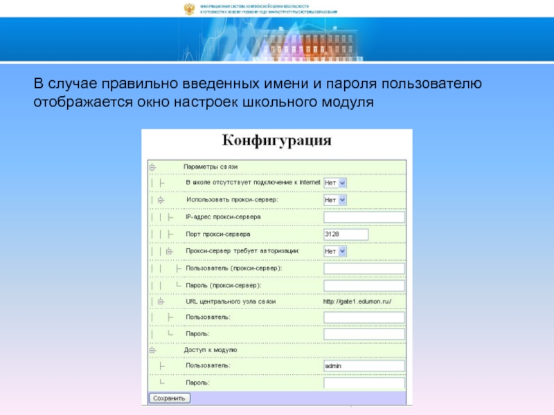 Слайд 26В случае правильно введенных имени и пароля пользователю отображается окно настроек