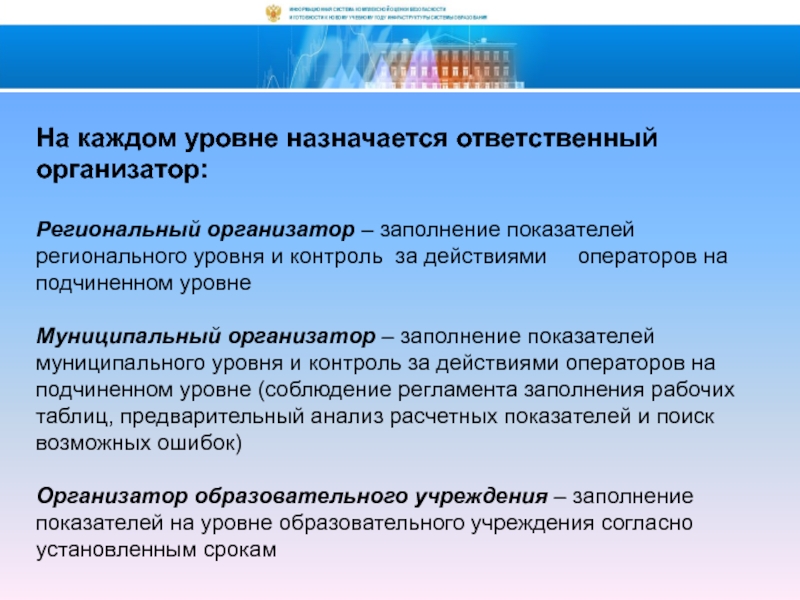 Муниципальный организатор – заполнение показателей муниципального уровня и контроль за действиями операторов на подчиненном уровне (соблюдение регламента заполнения рабочих таблиц, предварительный анализ расчетных показателей и поиск возможных ошибок)