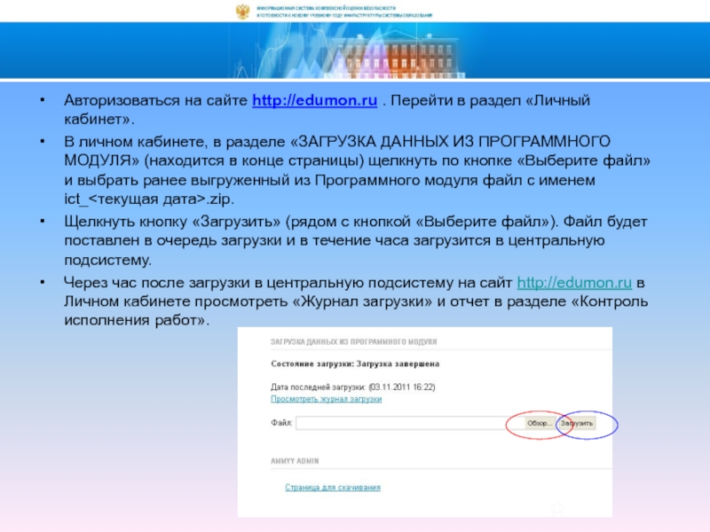 Через час после загрузки в центральную подсистему на сайт http://edumon.ru в Личном кабинете просмотреть «Журнал загрузки» и отчет в разделе «Контроль исполнения работ».