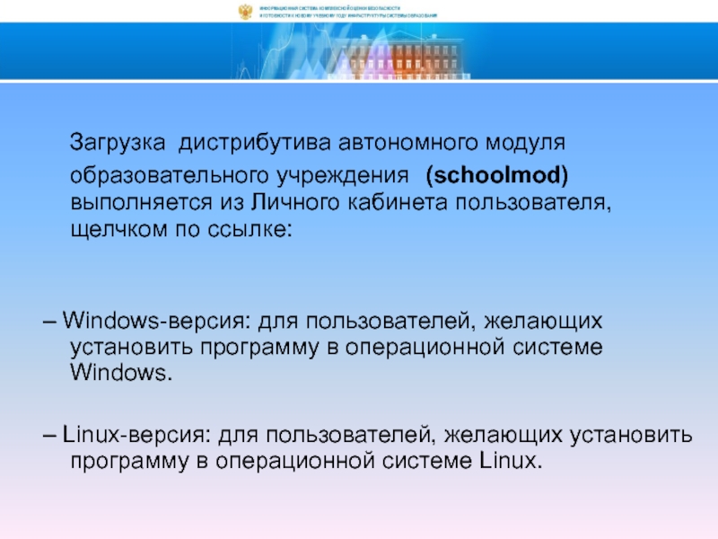 Слайд 23 Загрузка дистрибутива автономного модуля образовательного учреждения (schoolmod) выполняется из