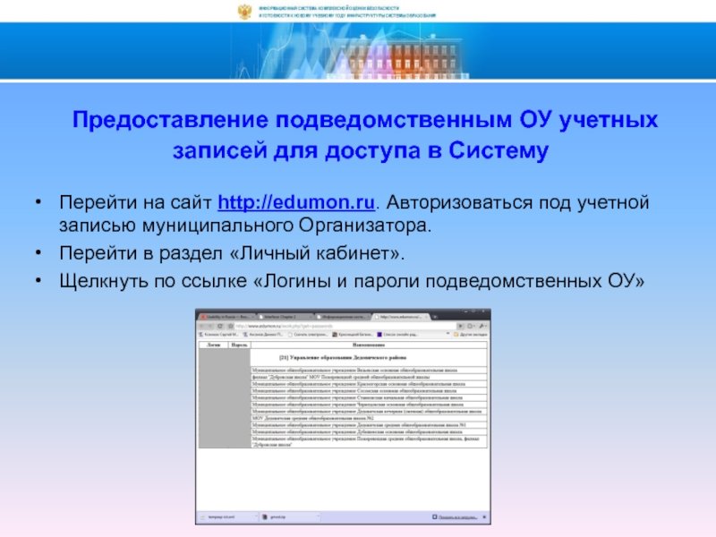 Слайд 20 Предоставление подведомственным ОУ учетных записей для доступа в Систему
