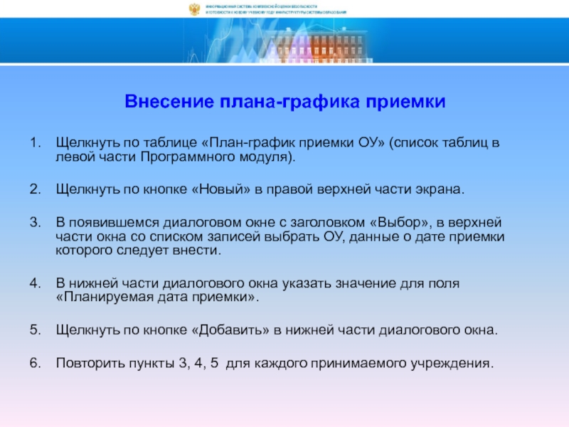 Щелкнуть по таблице «План-график приемки ОУ» (список таблиц в