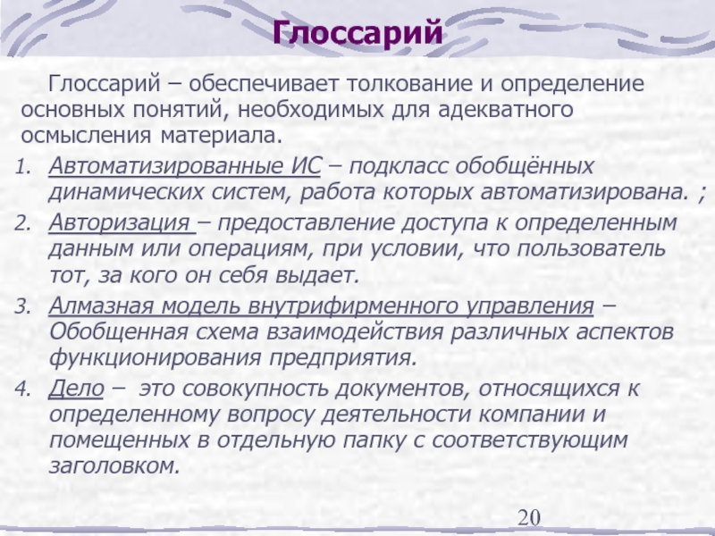 Глоссарий – обеспечивает толкование и определение основных понятий, необходимых для адекватного