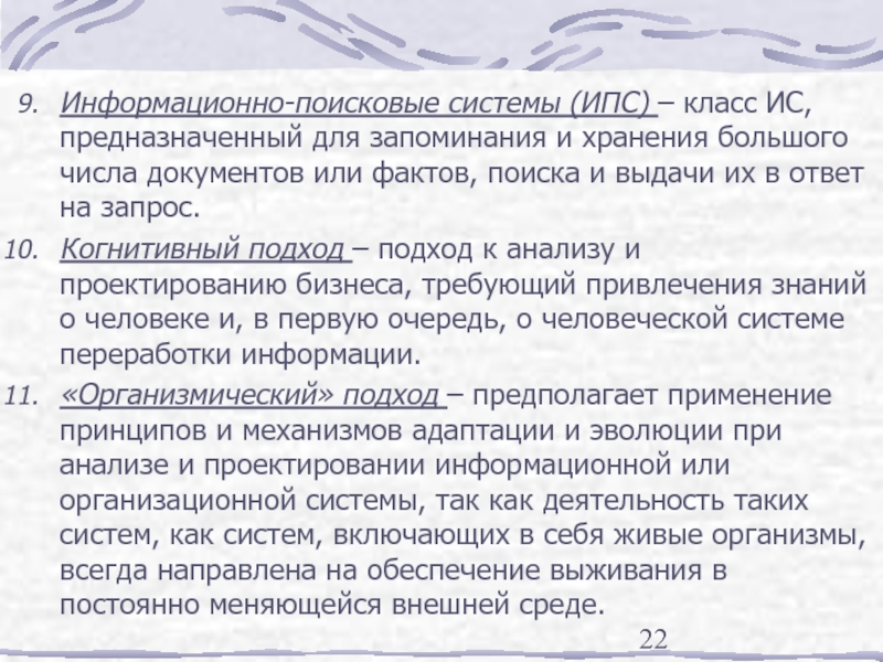 Слайд 22Информационно-поисковые системы (ИПС) – класс ИС, предназначенный для запоминания и хранения