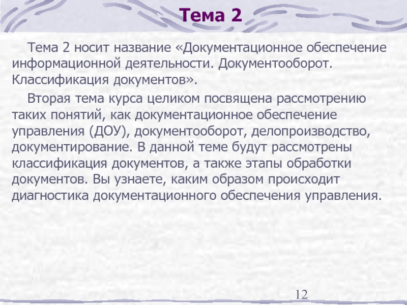 Вторая тема курса целиком посвящена рассмотрению таких понятий, как документационное обеспечение управления (ДОУ), документооборот, делопроизводство, документирование. В данной теме будут рассмотрены классификация документов, а также этапы обработки документов. Вы узнаете, каким образом происходит диагностика документационного обеспечения управления.