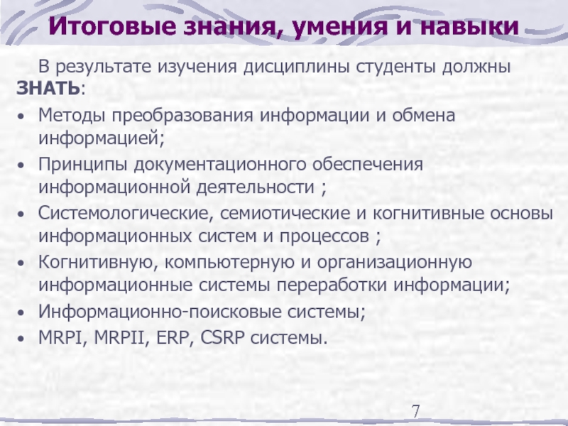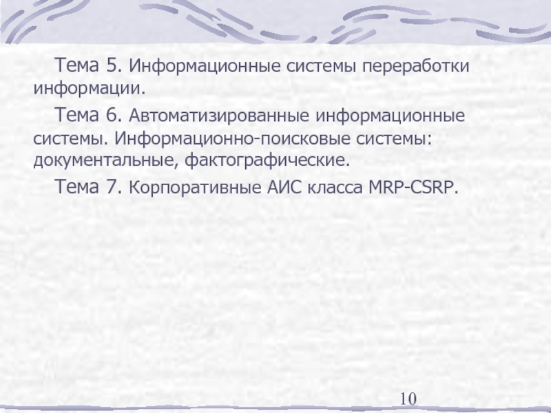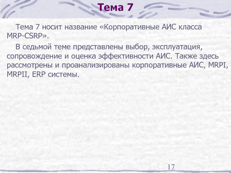 Тема 7 носит название «Корпоративные АИС класса MRP-CSRP».