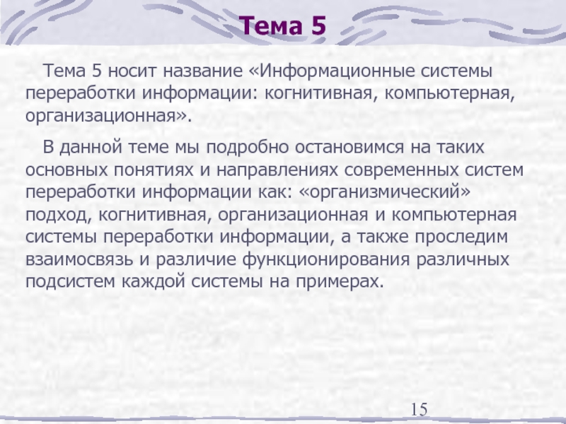 В данной теме мы подробно остановимся на таких основных понятиях и направлениях современных систем переработки информации как: «организмический» подход, когнитивная, организационная и компьютерная системы переработки информации, а также проследим взаимосвязь и различие функционирования различных подсистем каждой системы на примерах.