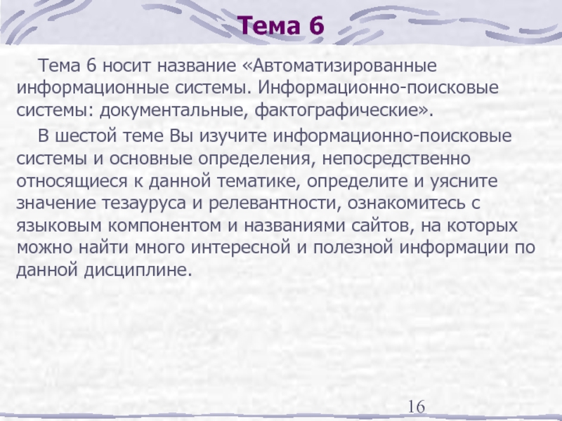 Тема 6 носит название «Автоматизированные информационные системы. Информационно-поисковые системы: документальные,
