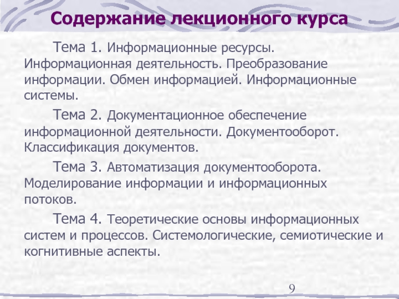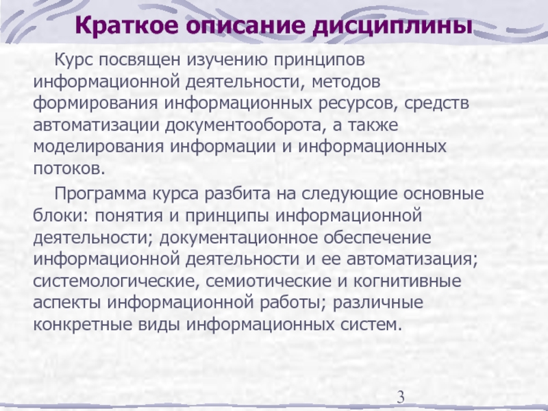 Программа курса разбита на следующие основные блоки: понятия и принципы информационной деятельности; документационное обеспечение информационной деятельности и ее автоматизация; системологические, семиотические и когнитивные аспекты информационной работы; различные конкретные виды информационных систем.