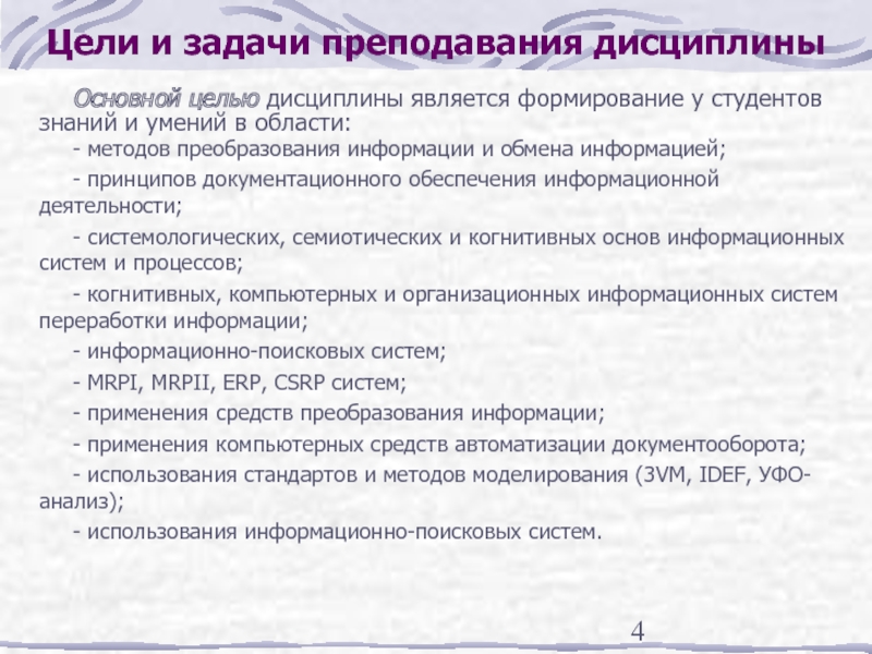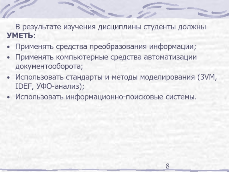 ресурсов, средств автоматизации документооборота, а также моделирования информации и информационных потоков.