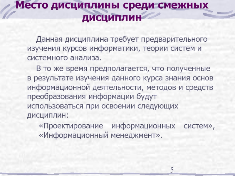 В то же время предполагается, что полученные в результате изучения данного курса знания основ информационной деятельности, методов и средств преобразования информации будут использоваться при освоении следующих дисциплин: