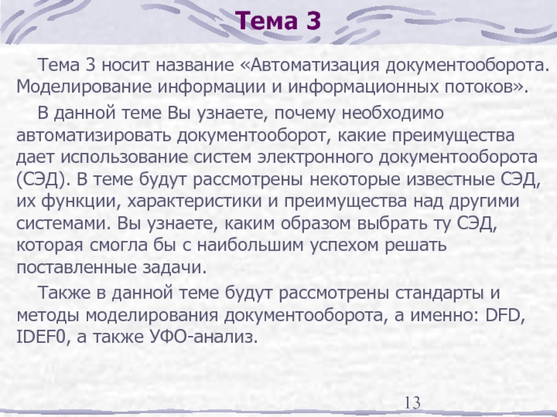 Тема 3 носит название «Автоматизация документооборота. Моделирование информации и информационных