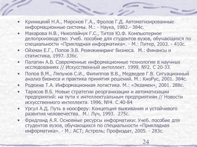 Слайд 24Криницкий Н.А., Миронов Г.А., Фролов Г.Д. Автоматизированные информационные системы. М.: -