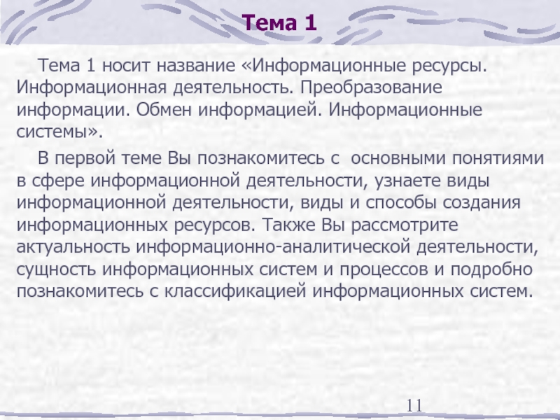 Тема 1 носит название «Информационные ресурсы. Информационная деятельность. Преобразование информации.