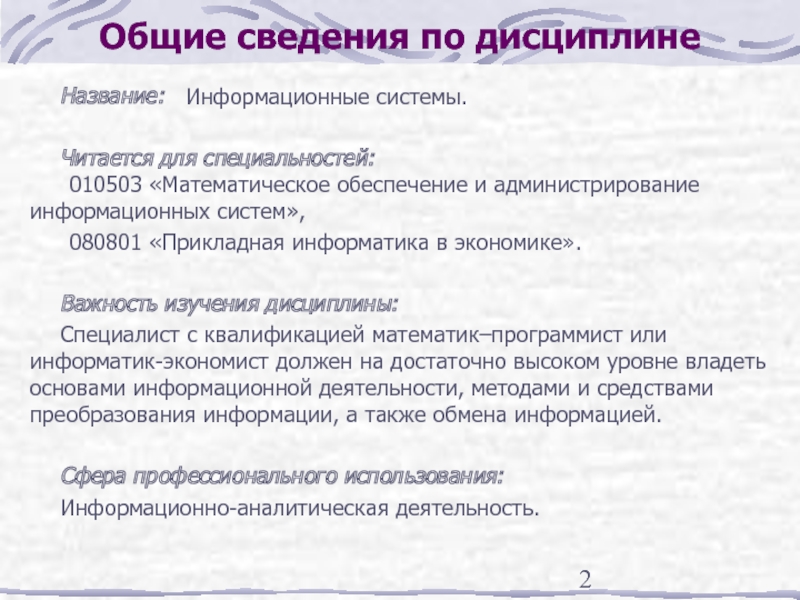 Специалист с квалификацией математик–программист или информатик-экономист должен на достаточно высоком уровне владеть основами информационной деятельности, методами и средствами преобразования информации, а также обмена информацией.