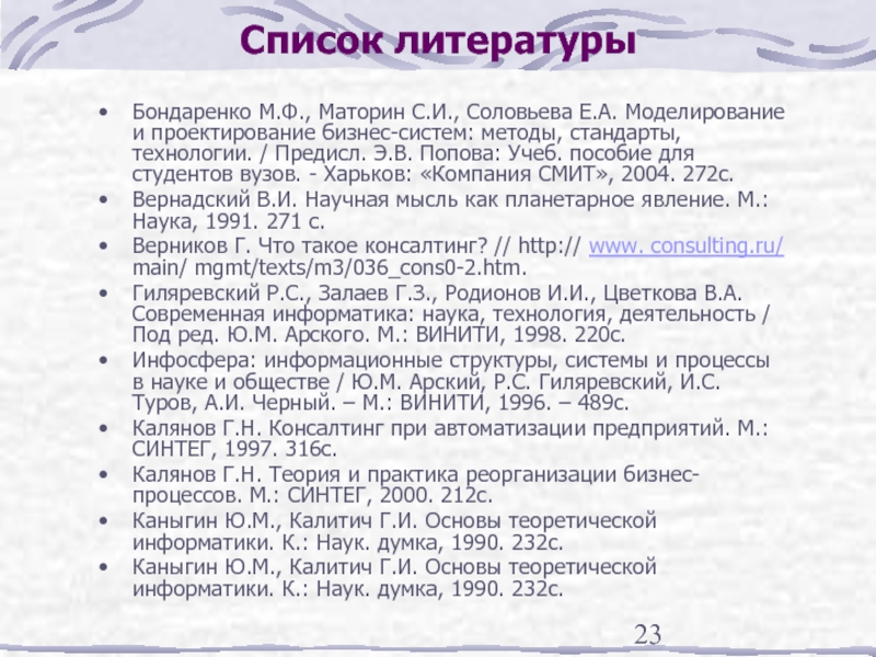 Калянов Г.Н. Консалтинг при автоматизации предприятий. М.: СИНТЕГ, 1997. 316с.