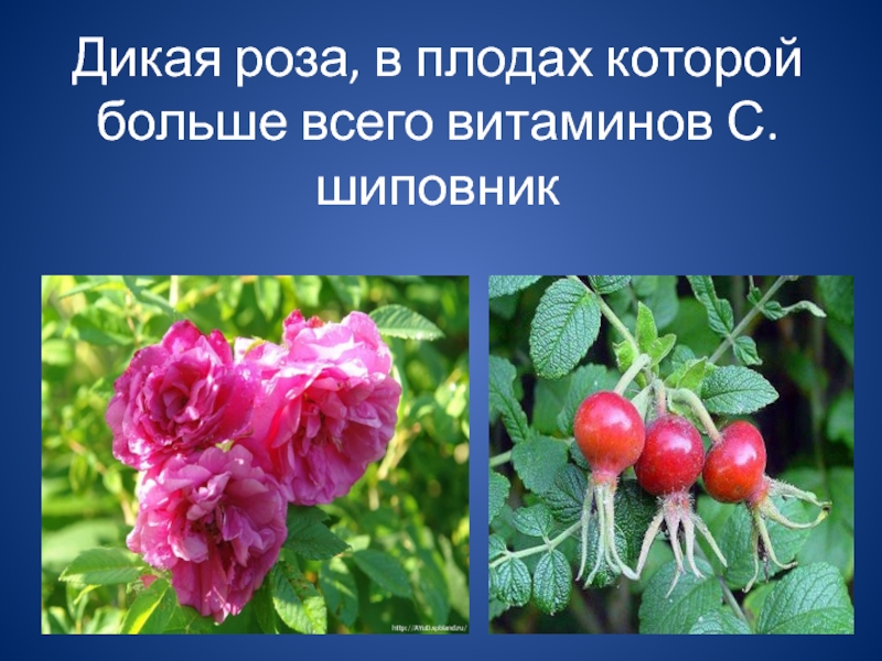 Слайд 10Дикая роза, в плодах которой больше всего витаминов С.