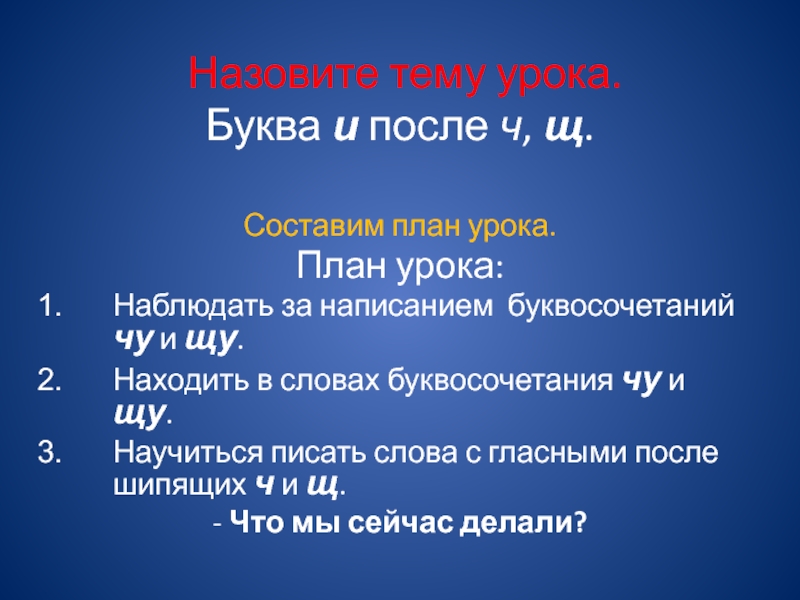 Наблюдать за написанием буквосочетаний чу и щу.