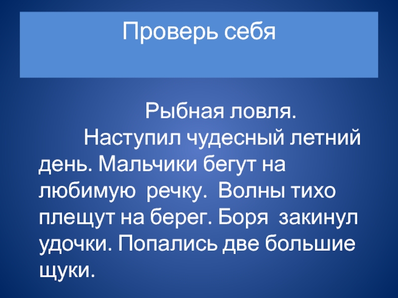 Наступил чюдесный летний день. Мальчики бегут на любимую речку. Волны тихо плещют на берег. Боря закинул удочки. Попались две большие щюки.