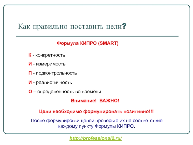 После формулировки целей проверьте их на соответствие каждому пункту Формулы КИПРО.
