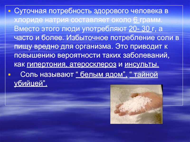 Слайд 5Суточная потребность здорового человека в хлориде натрия составляет около 6 грамм.