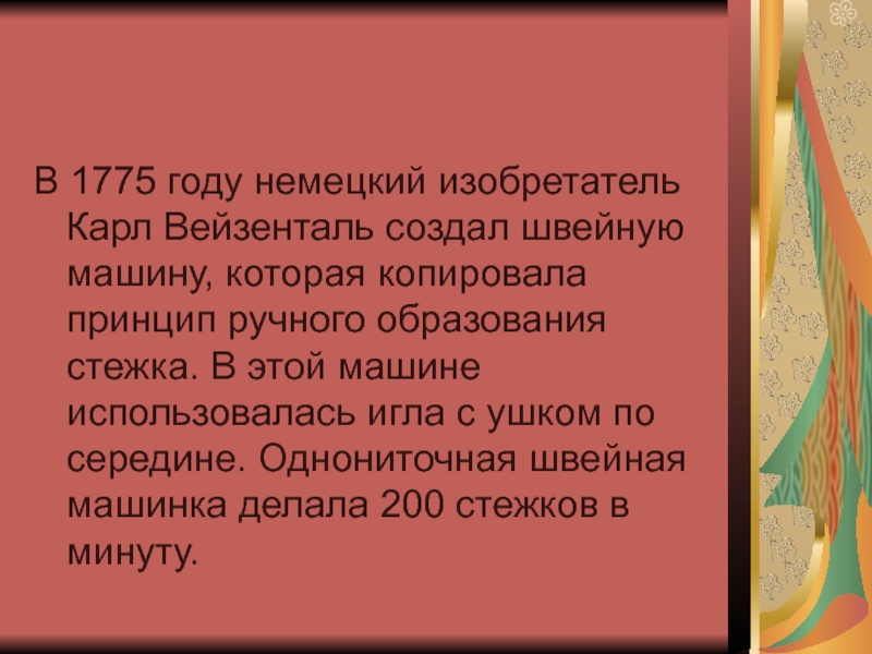 Слайд 4В 1775 году немецкий изобретатель Карл Вейзенталь создал швейную машину, которая