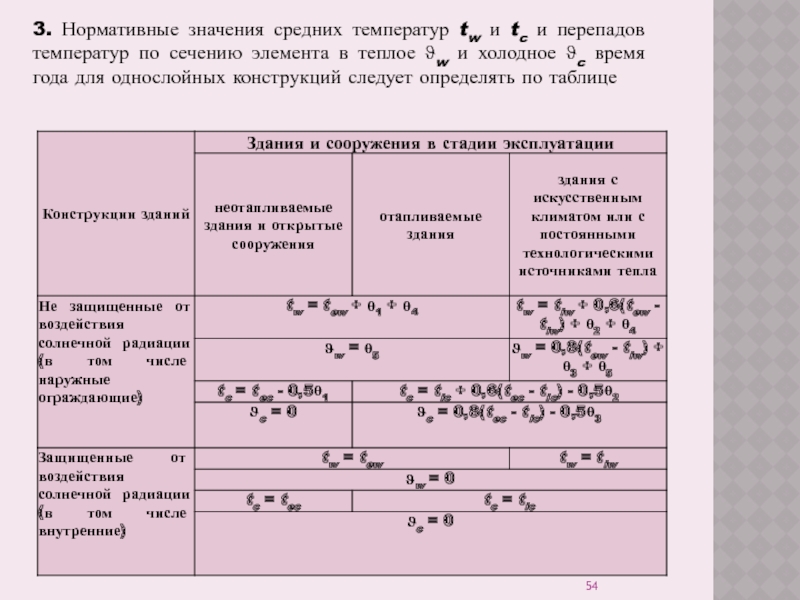 Слайд 543. Нормативные значения средних температур tw и tc и перепадов температур