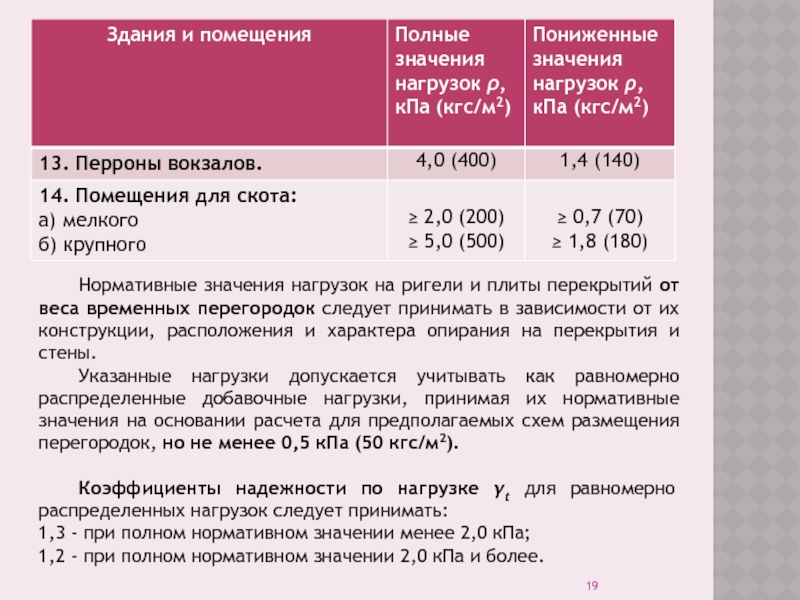 Слайд 19 Нормативные значения нагрузок на ригели и плиты перекрытий от веса временных