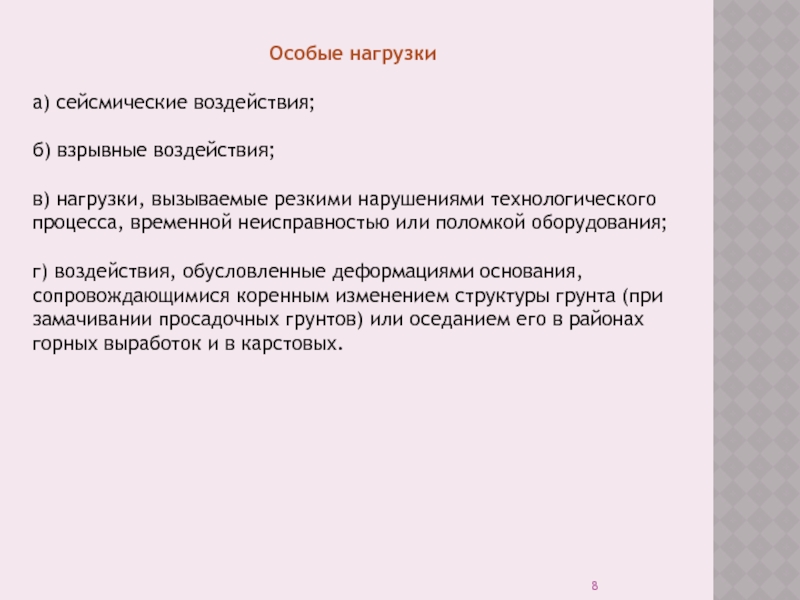г) воздействия, обусловленные деформациями основания, сопровождающимися коренным изменением структуры грунта (при замачивании просадочных грунтов) или оседанием его в районах горных выработок и в карстовых.