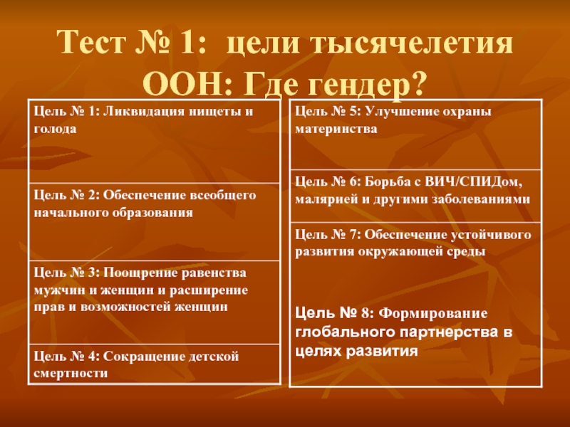 Слайд 44Тест № 1: цели тысячелетия ООН: Где гендер?